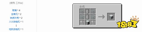 地热发电机只能在作业台制造,制造地热发电机需求4个玻璃、2个空单元、2个铁质外壳和1个火力发电机